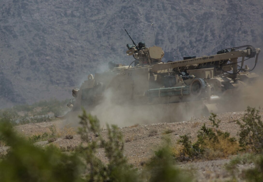 An M88 Recovery Vehicle with A Company, 4th Tank Battalion, 4th Marine Division, follows behind the main attack body of the mechanized assault course during Integrated Training Exercise 4-19 at Marine Corps Air Ground Combat Center, Twentynine Palms, Calif., June 12, 2019. Today’s Marine Reserve is a critical component of the Marine Corps’ Total Force, and training like ITX helps ensure Reserve units combat effectiveness and proficiency for world-wide deployment. (U.S. Marine Corps photo by Lance Cpl. Preston L. Morris)
