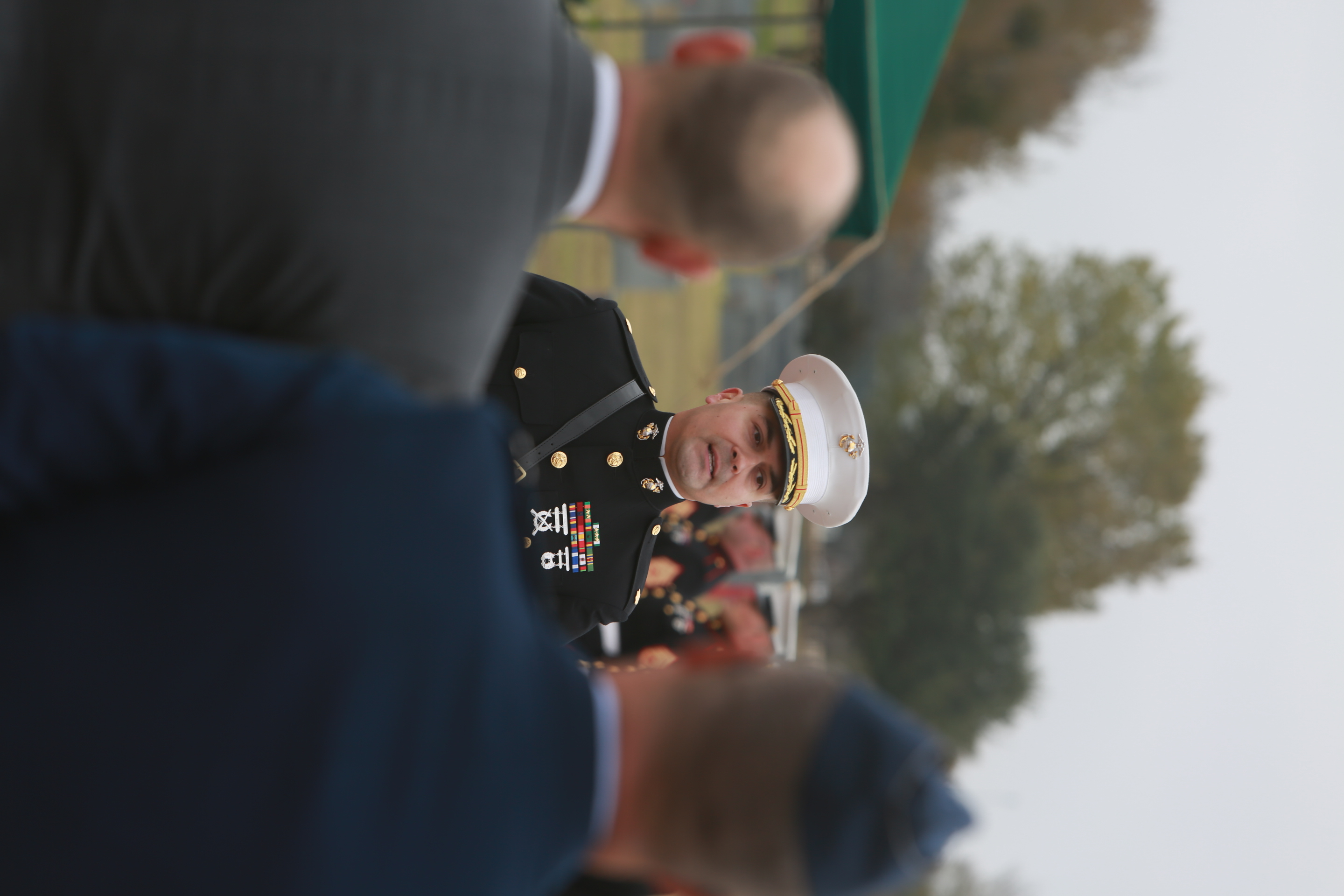 U.S. Marine Corps Maj. Mark Gutierrez honors deceased Lt. Gen. John H. Miller (ret.) at Aggie Field of Honor and Memorial Cemetery, College Station, Texas, Dec. 5, 2025. Lt. Gen. Miller (ret.), highly decorated Marine, served loyally for nearly four decades in the United States Marine Corps. He began his career in 1943, enlisting in the Marine Corps Reserve, attended and commissioned as a Marine Corps officer out of Texas A&M and retired as a Lt. Gen., serving in three different wars. He served valiantly earning a Bronze Star Medal and the Purple Heart Medal among other military awards. (U.S. Marine Corps photo by LCpl. Donnell Brown)