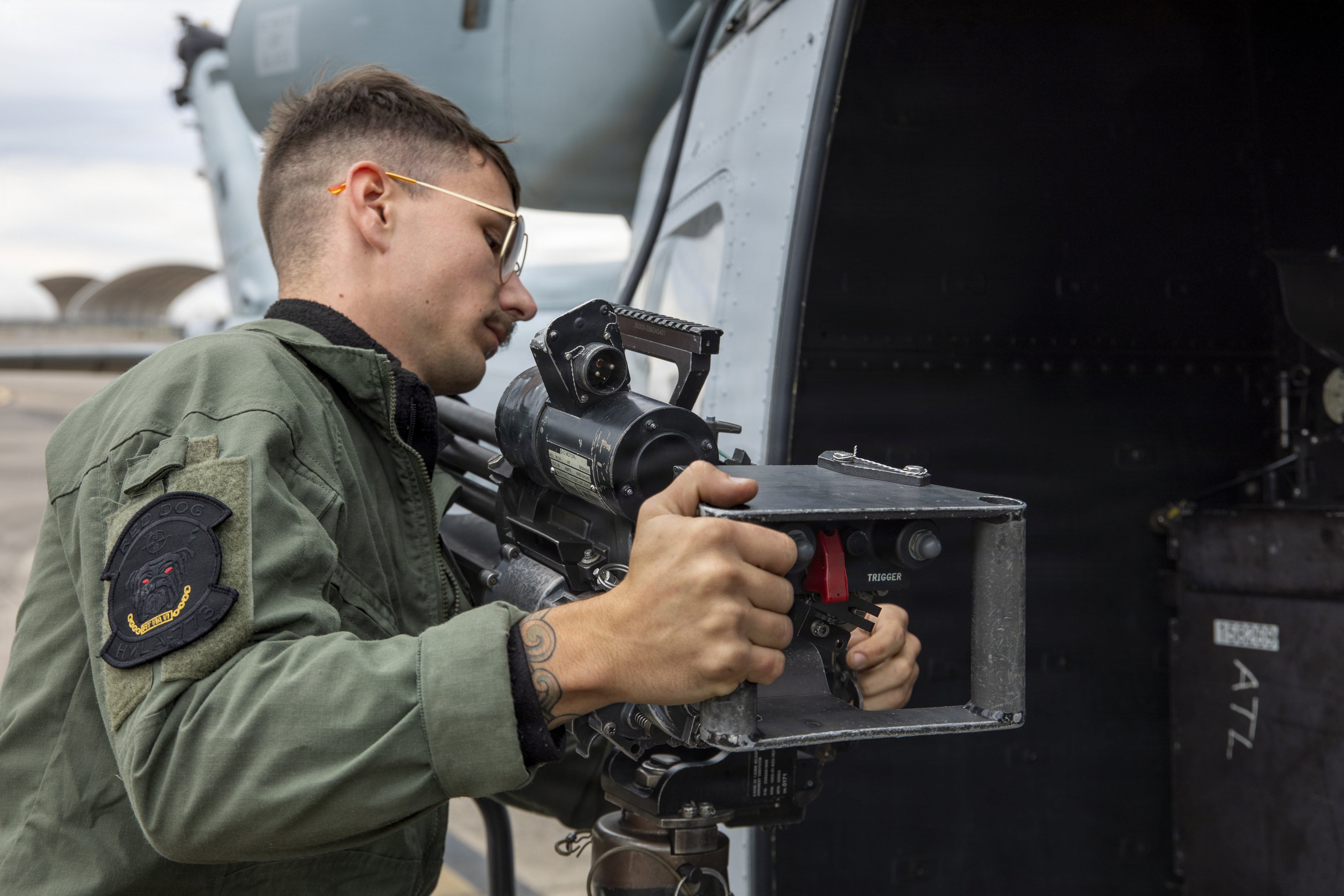 U.S. Marine Corps Sgt. Ryan Helmstetter, a helicopter crew chief with Marine Light Attack Helicopter Squadron (HMLA) 773, Marine Aircraft Group 49, 4th Marine Aircraft Wing, conducts preflight checks on a UH-1Y Venom utility helicopter in support of tactical air-control party (TACP) at Naval Air Station Joint Reserve Base New Orleans, Louisiana, Dec. 2, 2025. TACP was held at Camp Shelby, Mississippi, the exercise prepares prospective joint terminal attack controllers and joint fires observers for formal schools. (U.S. Marine Corps photo by Staff Sgt. Ethan M. LeBlanc)