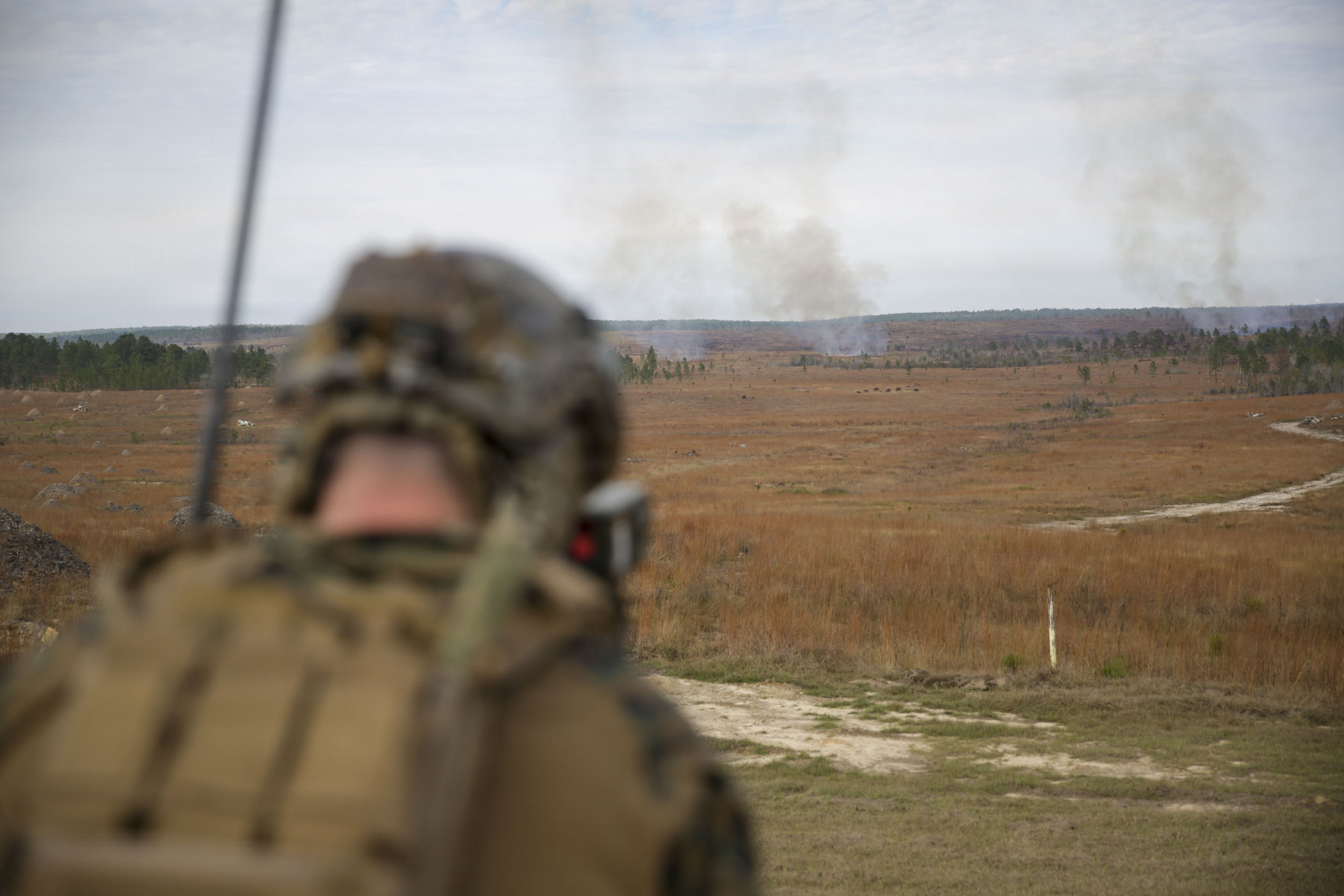 U.S. Marine Corps Sgt. Dylan Rodgers, a joint terminal attack controller with 3rd Force Reconnaissance, 4th Marine Division, Marine Forces Reserve, observes impacts of close-air support ordinance from a C-130J Super Hercules with Marine Aerial Refueler Transport Squadron (VMGR) 234 during a tactical air-control party (TACP) exercise in Hattiesburg, Mississippi, Dec. 3, 2025. TACP exercises prepare prospective joint terminal attack controllers and joint fires observers for formal schools. (U.S. Marine Corps photos by Lance Cpl. Payton Goodrich)