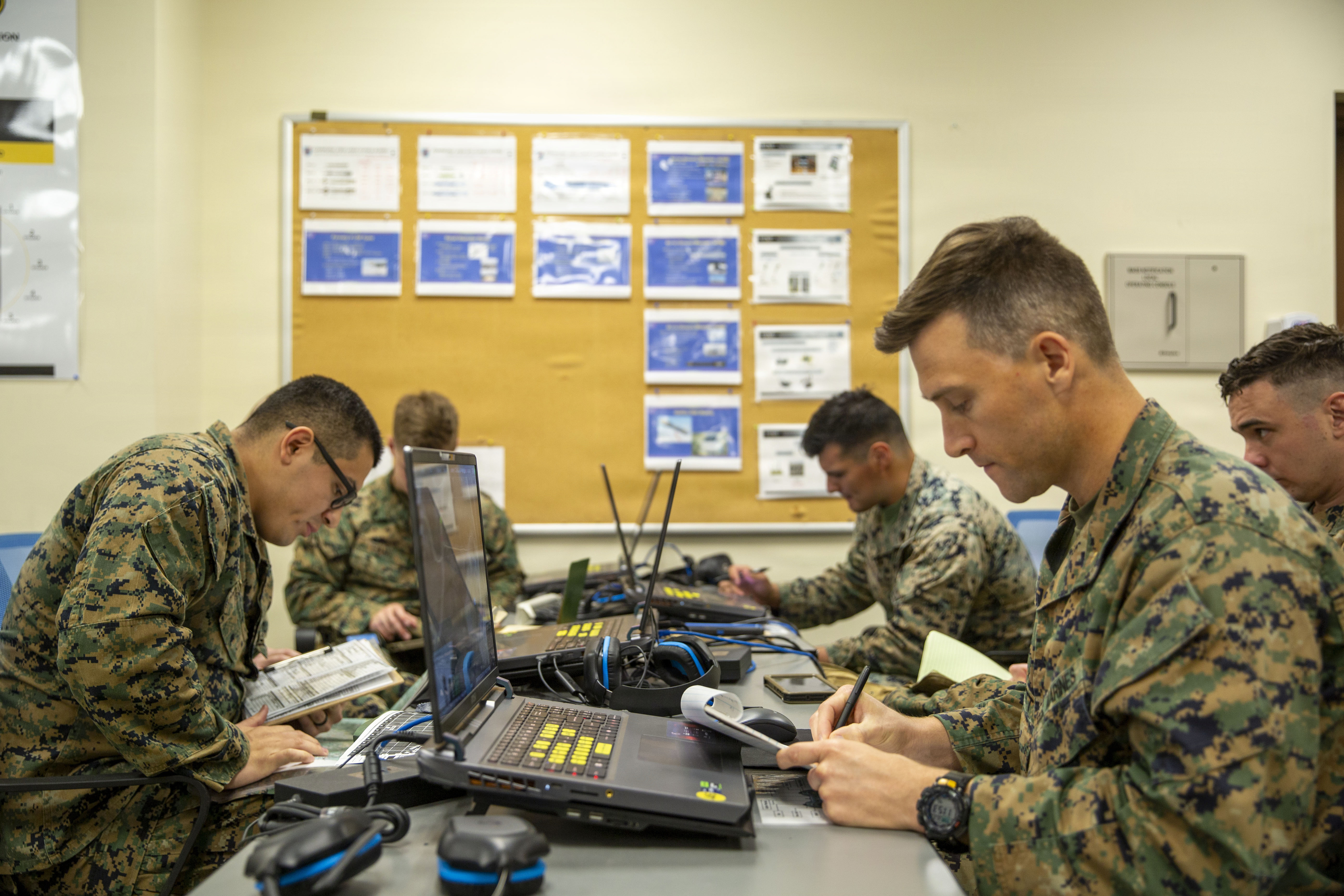 U.S. Marines with 6th Naval Gunfire Liaison Company, Force Headquarters Group, Marine Forces Reserve, simulate plotting and calling in close air support at the Simulated Combat Center on Camp Shelby in Hattiesburg, Mississippi, Dec. 2, 2025. TACP exercises prepare prospective joint terminal attack controllers and joint fires observers for formal schools. (U.S. Marine Corps photo by Lance Cpl. Payton Goodrich)