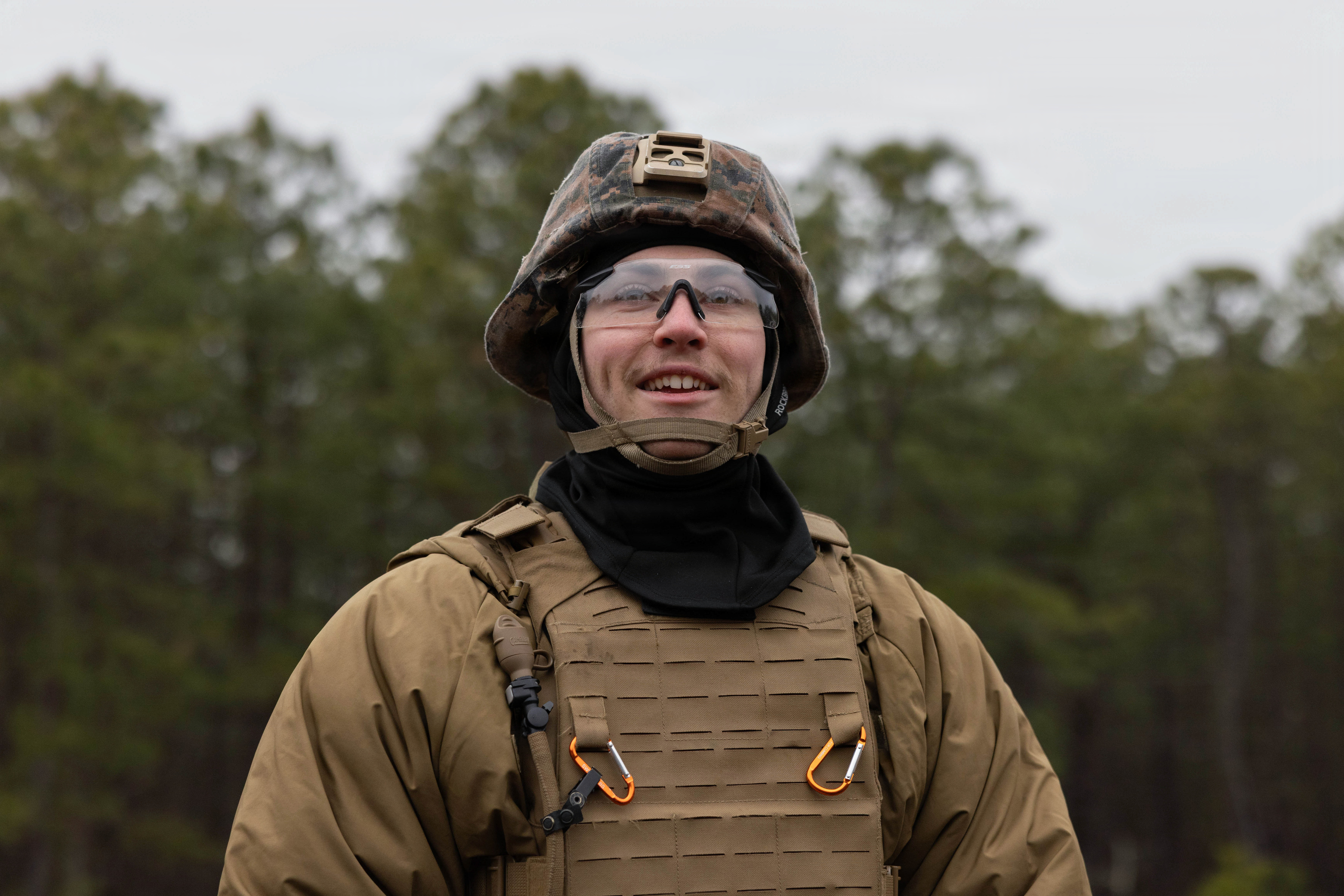 U.S. Marine Corps Lance Cpl. Samuel Tomlinson, a mortarman, poses for a photo during a live-fire exercise at Joint Base McGuire-Dix-Lakehurst, New Jersey, Dec. 6, 2025. Tomlinson, with 2nd Battalion, 25th Marine Regiment, 4th Marine Division, participates in live-fire drills with M252A2 81mm mortar systems to improve tactical decision-making, leadership and technical skills while ensuring readiness for future missions. (U.S. Marine Corps photo by Lance Cpl. Breysson Villacortacampos)