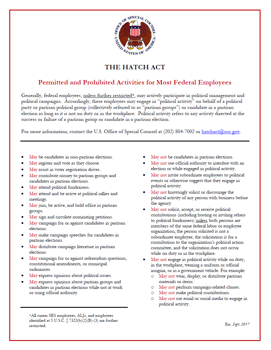 The Hatch Act protects military members and civilian employees from coercion or other detrimental actions caused by political association, and it’s important to know which rules apply to you. Application of the rules varies depending on an employee’s position or office.