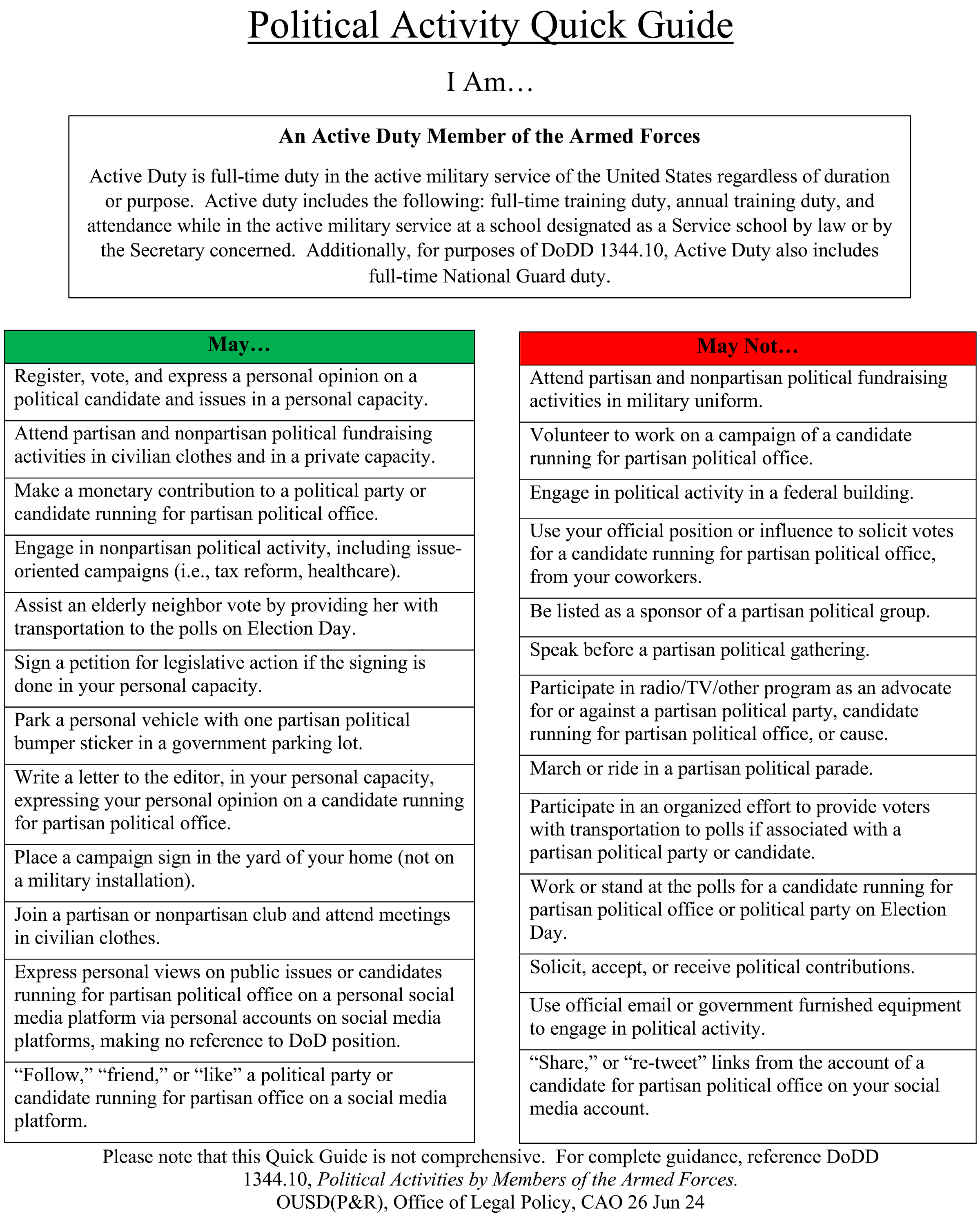 Uniform and Official Positions: Avoid posting content related to political matters while in uniform or using any official military titles or affiliations.